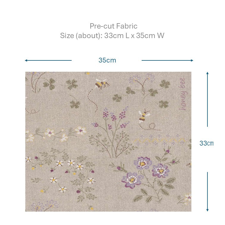Cotton print fabric with large flowers and bees in various embroidery stitches on a gray background.