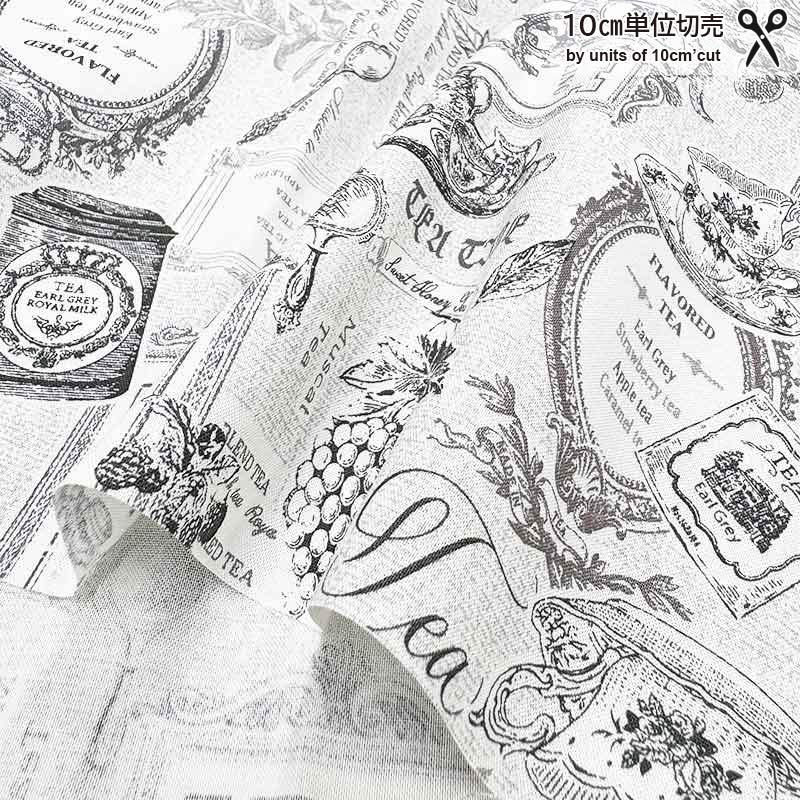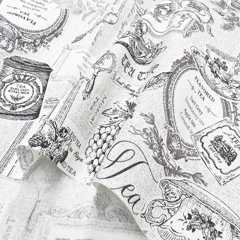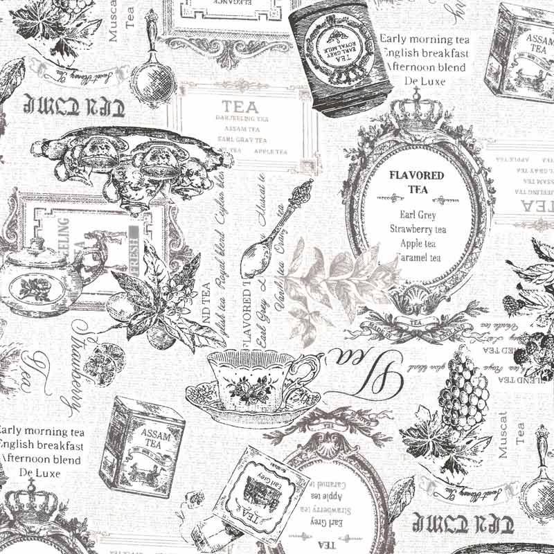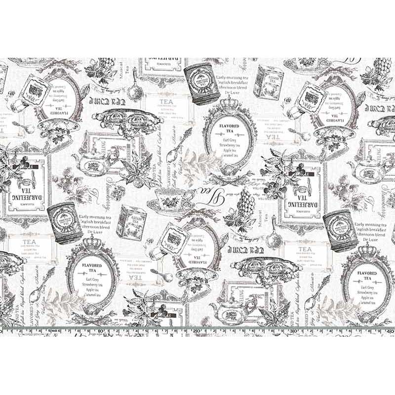 Cotton print fabric with antique-style teacups and pots, tea labels, and fruit illustrations.