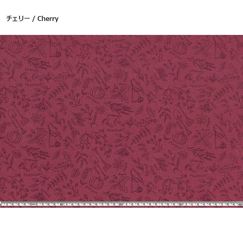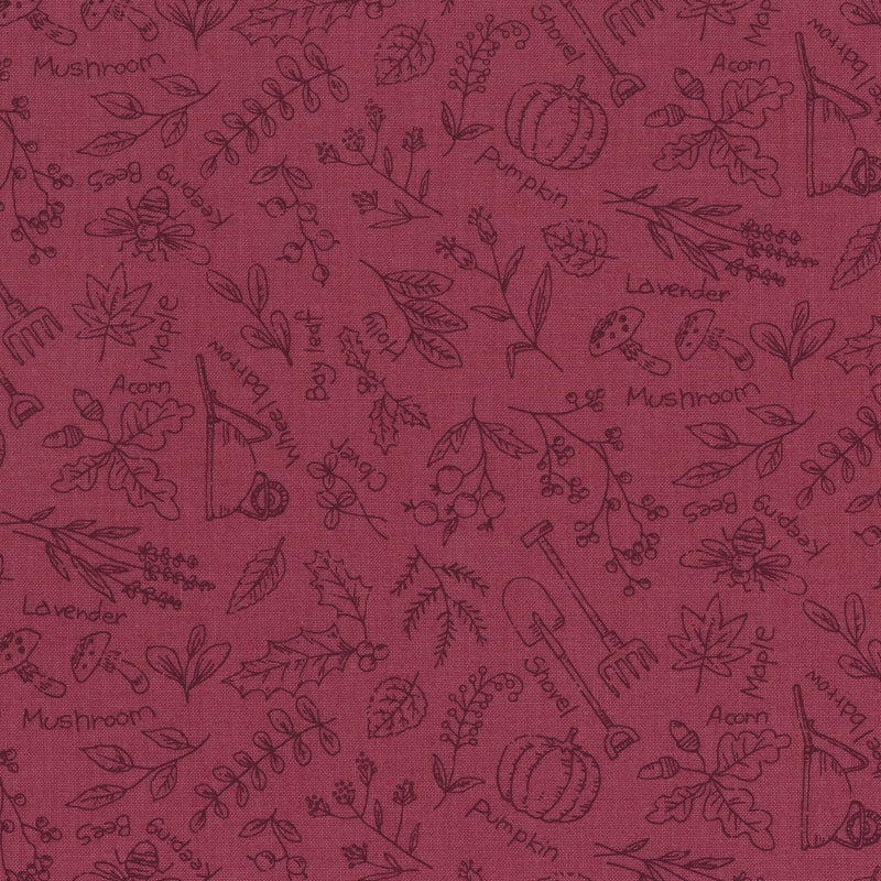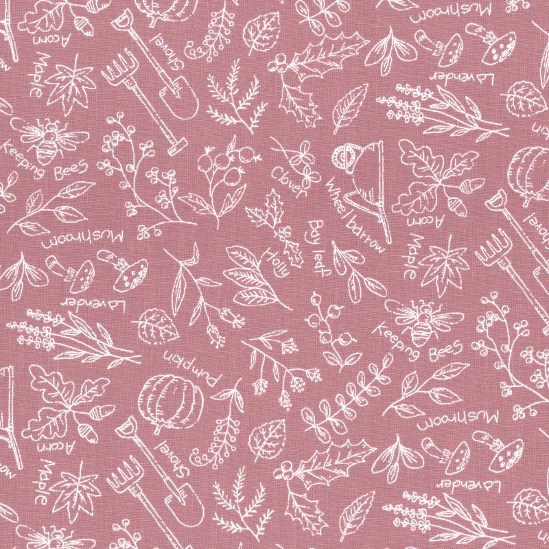 The design combines botanical motifs such as pumpkins, mushrooms, acorns, and lavender with gardening items.