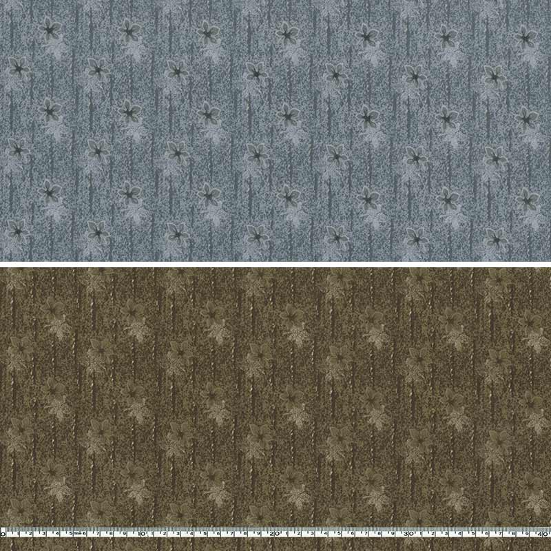 Cotton print fabric with maple-like leaves on a strip patterned background.