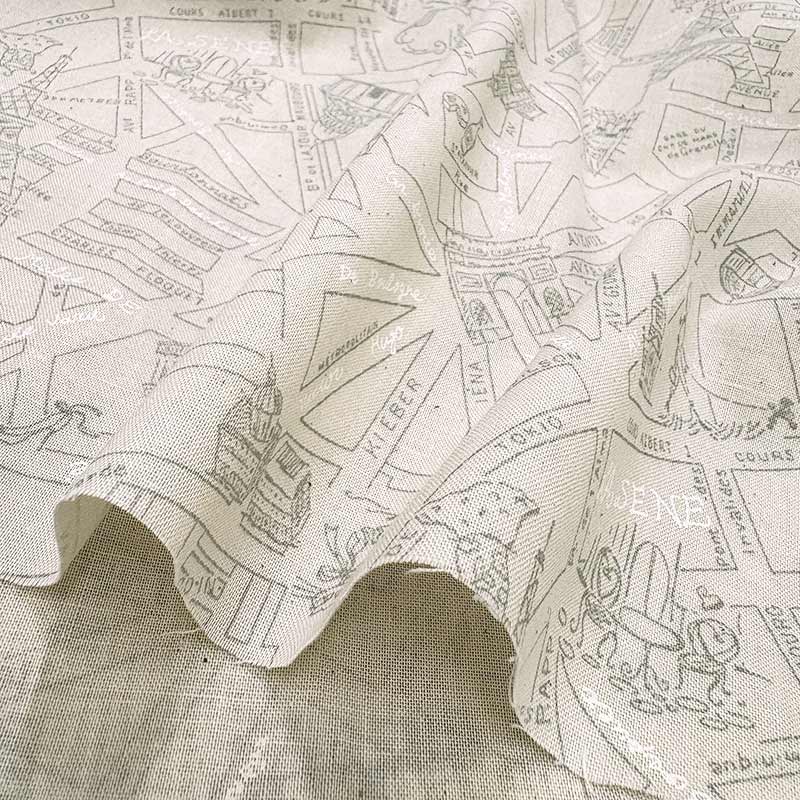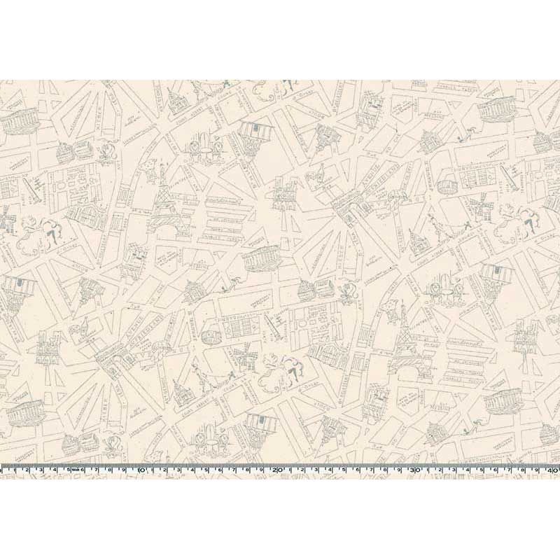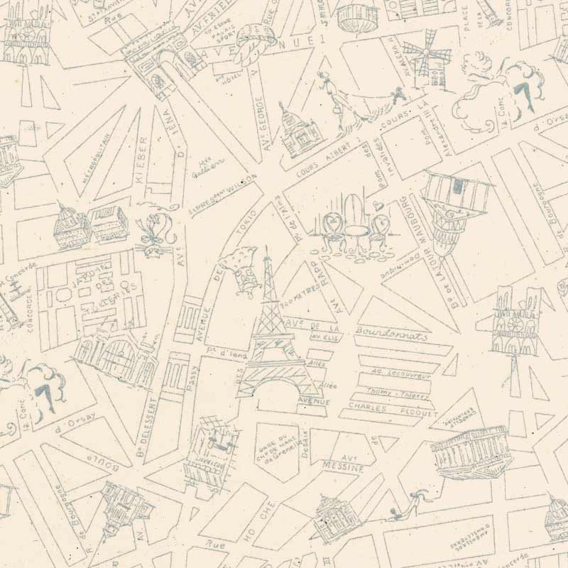 Cotton print fabric with hand-drawn illustrations of Paris, including the Eiffel Tower and the Arc de Triomphe.