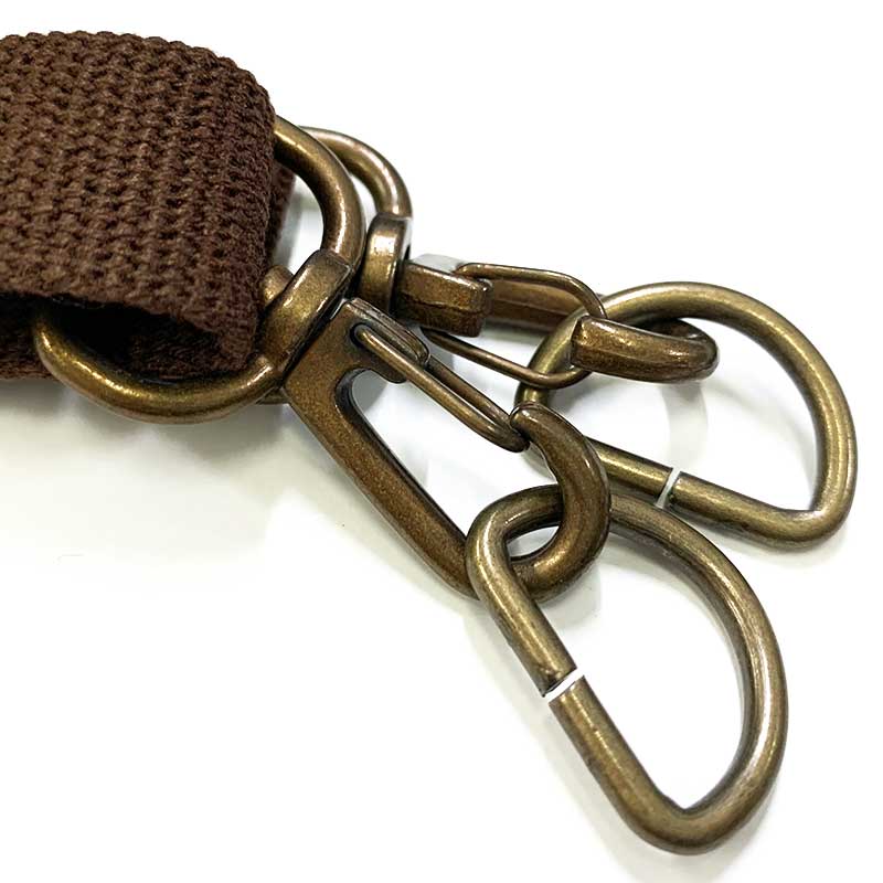 Acrylic tape shoulder strap with one metal sliding bar buckle, 2 metal swivel clips, 2 metal D-shaped buckles.