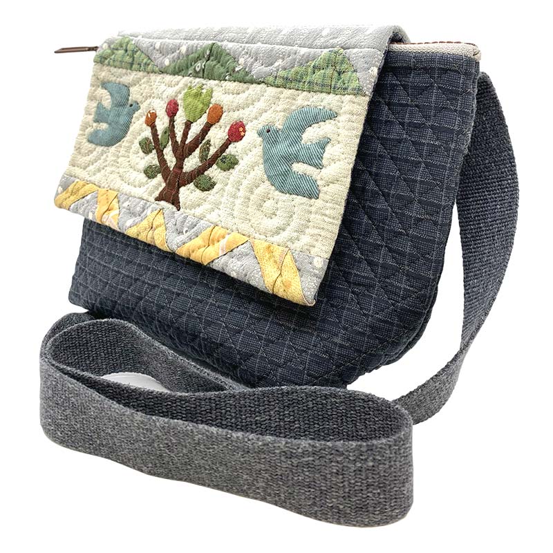 This shoulder bag is easy to use with wide gussets and zipper. The small birds and tree appliques on the flap are the good accents.